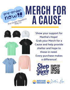 Wear your support proudly with our exclusive Day of Kindness merch! Every T-shirt, sweatshirt, and hat helps fund the mission of Martha’s Hope.